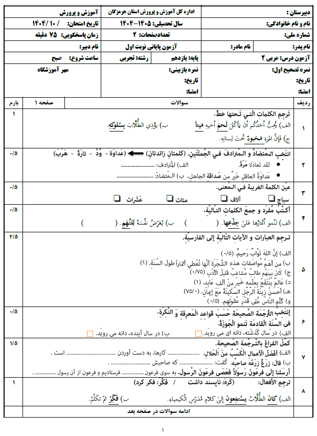 دانلود نمونه سوالات امتحانی عربی یازدهم تجربی و ریاضی نوبت اول ۱۴۰۴ به صورت word؛