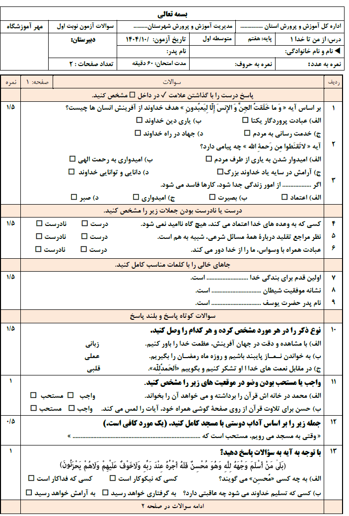 محتویات فایل: نمونه سوال امتحانی از من تا خدا هفتم + پاسخنامه در پایان سوالات + بارم بندی جدید