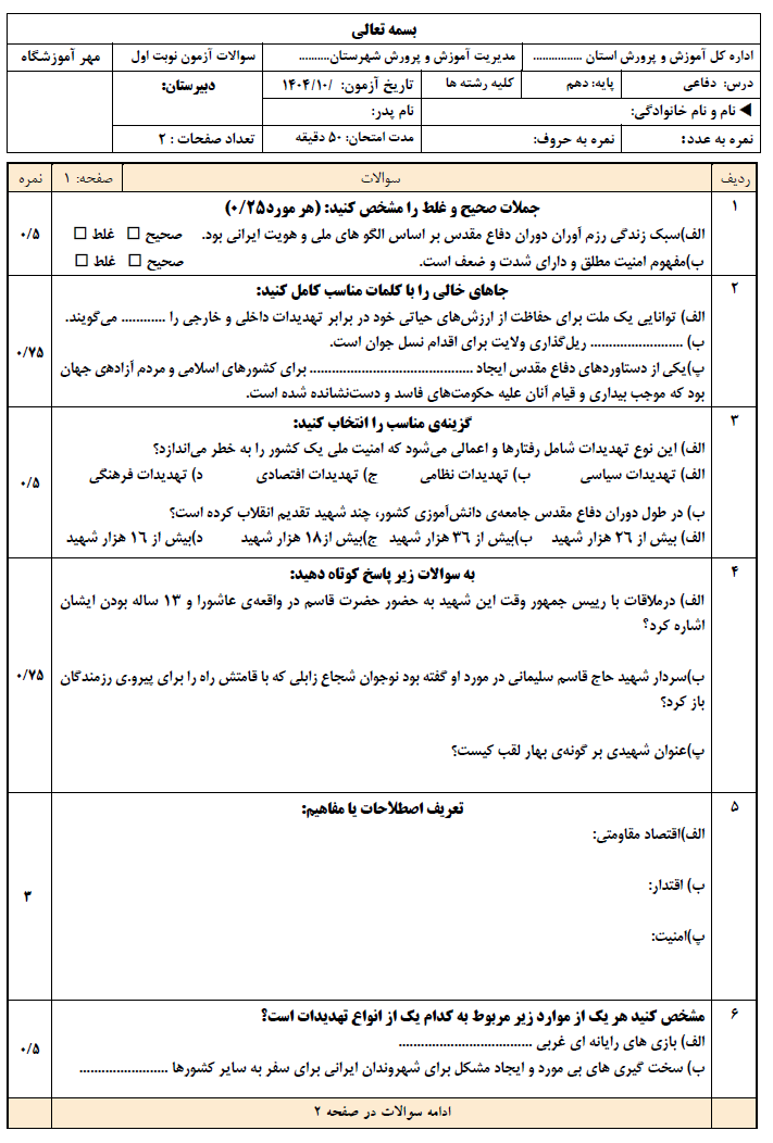دانلود نمونه سوالات امتحانی آمادگی دفاعی دهم نوبت اول ۱۴۰۴ به صورت word؛