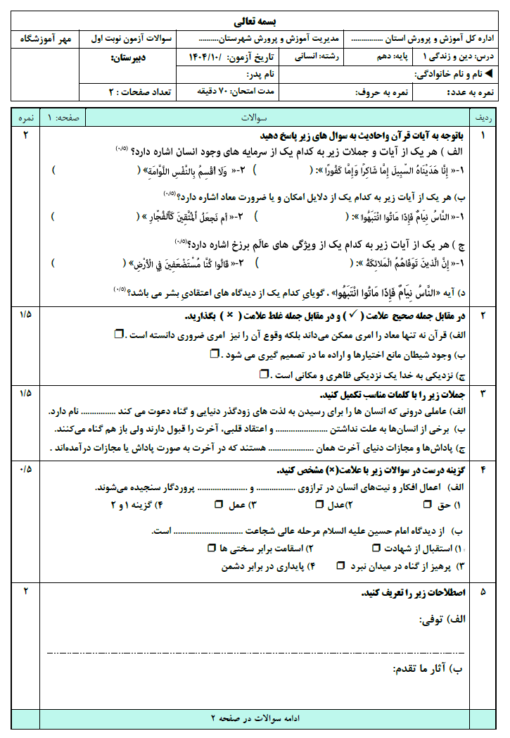 دانلود نمونه سوالات امتحانی دین و زندگی دهم انسانی نوبت اول ۱۴۰۴ به صورت word؛
