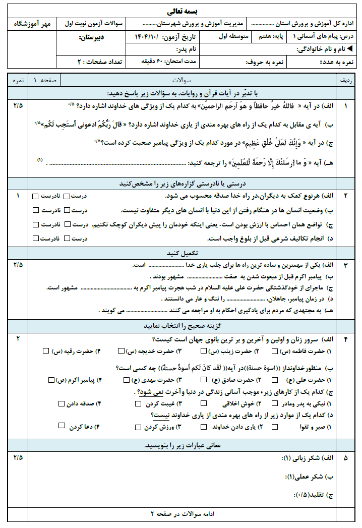 محتویات فایل: نمونه سوال امتحانی پیام های آسمانی هفتم + پاسخنامه در پایان سوالات + بارم بندی جدید