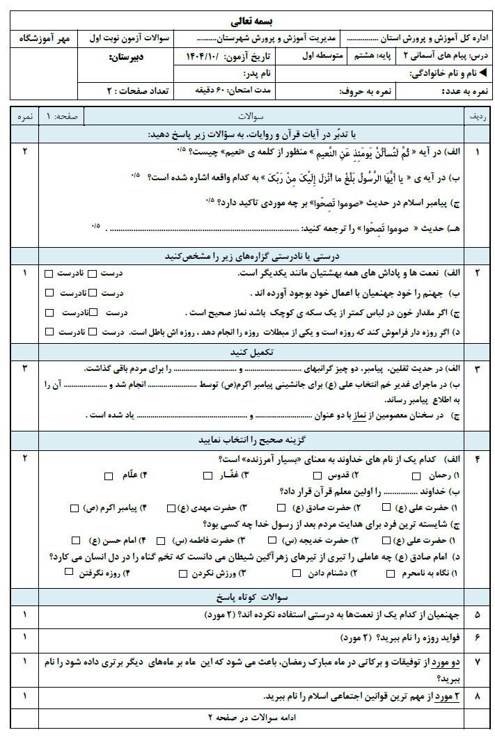 محتویات فایل: نمونه سوال امتحانی پیام های آسمانی نهم + پاسخنامه در پایان سوالات + بارم بندی جدید