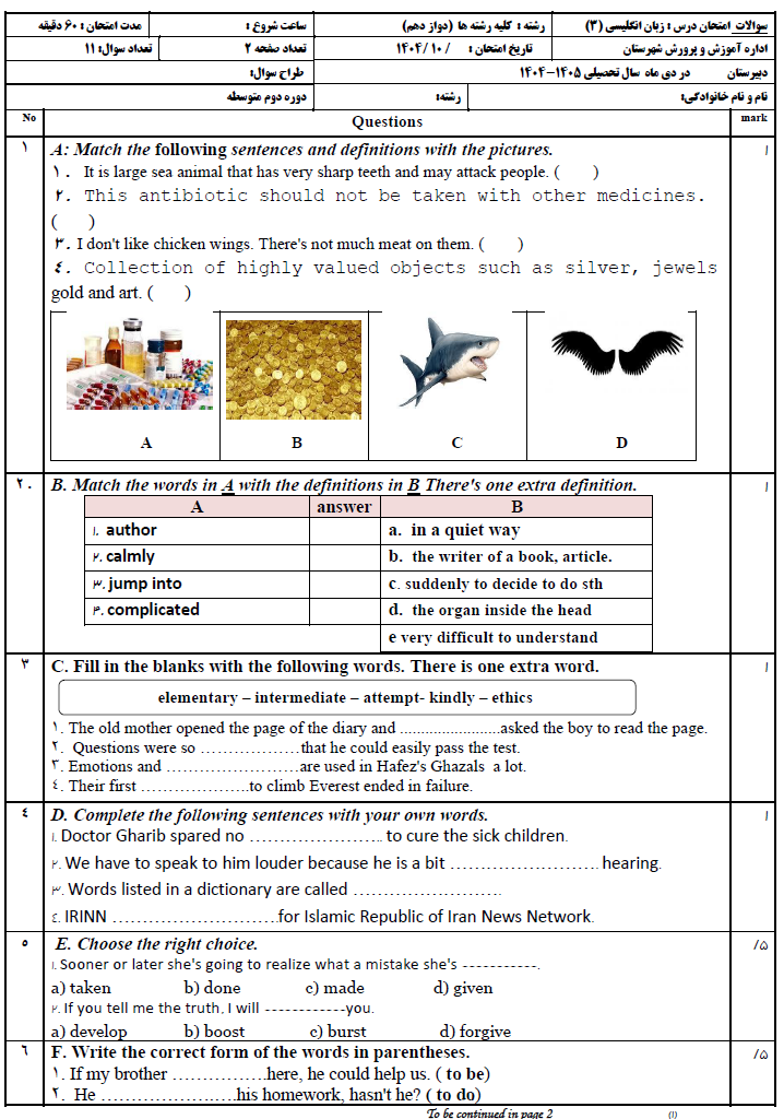 دانلود نمونه سوالات امتحانی انگلیسی دوازدهم نوبت اول ۱۴۰۴ به صورت word؛