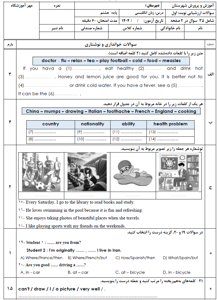 محتویات فایل: نمونه سوال امتحانی انگلیسی هشتم + پاسخنامه در پایان سوالات + بارم بندی جدید
