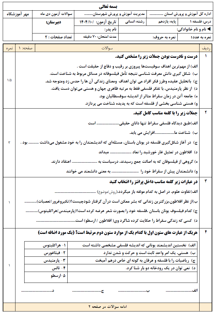 محتویات فایل: نمونه سوال امتحانی فلسفه یازدهم + پاسخنامه در پایان سوالات + بارم بندی جدید