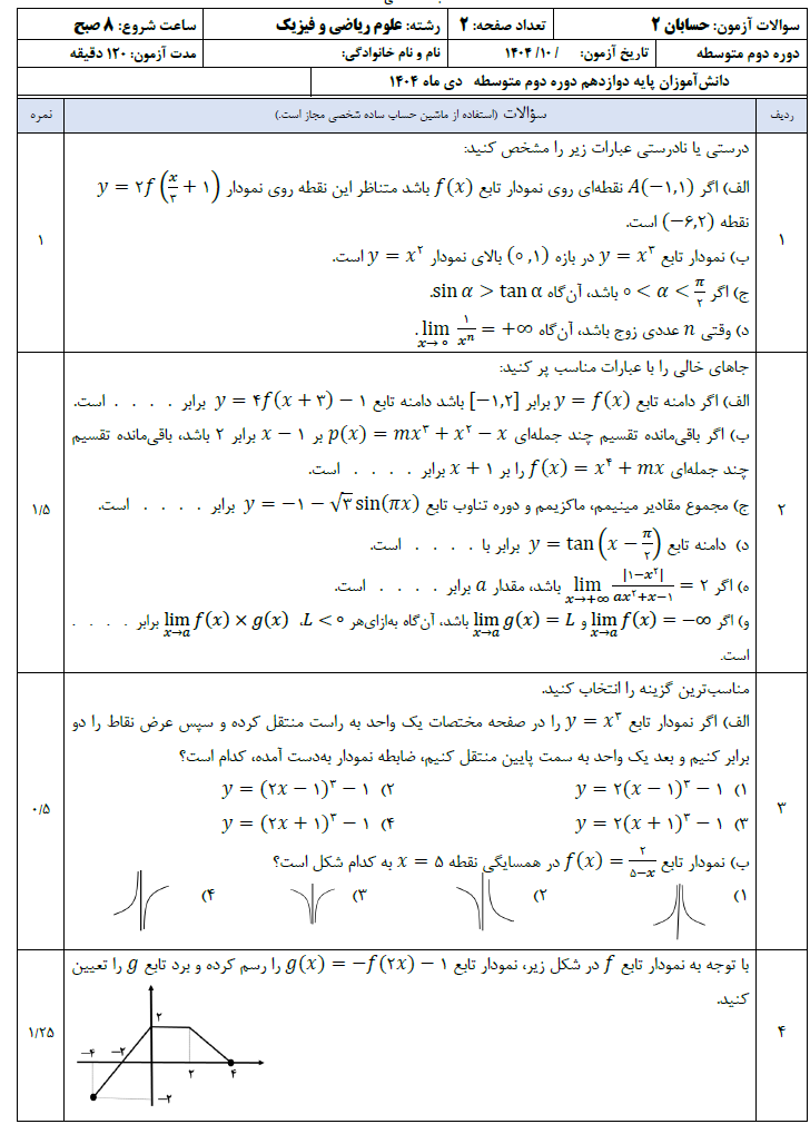 دانلود نمونه سوالات امتحانی حسابان دوازدهم رشته ریاضی نوبت اول ۱۴۰۴ به صورت word؛