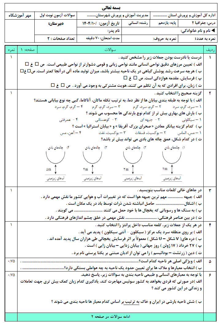 دانلود نمونه سوالات امتحانی جغرافیا یازدهم نوبت اول ۱۴۰۴ به صورت word؛