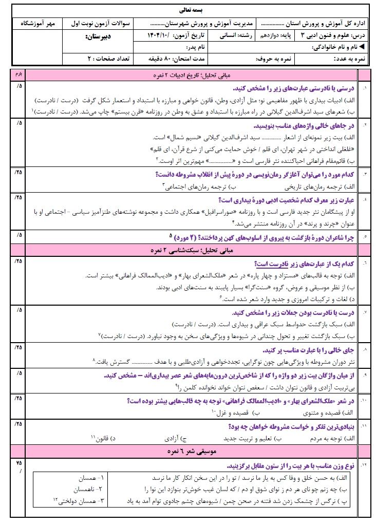 محتویات فایل: نمونه سوال امتحانی فارسی دوازدهم + پاسخنامه در پایان سوالات + بارم بندی جدید