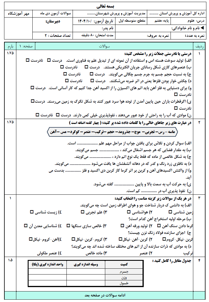دانلود نمونه سوالات امتحانی فارسی علوم هفتم نوبت اول ۱۴۰۴ به صورت word؛