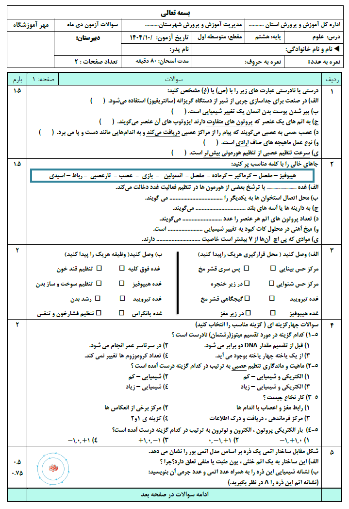 دانلود نمونه سوالات امتحانی فارسی علوم هشتم نوبت اول ۱۴۰۴ به صورت word؛