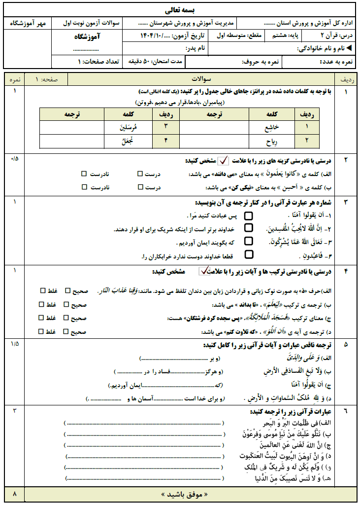 محتویات فایل: نمونه سوال امتحانی قرآن هشتم + پاسخنامه در پایان سوالات + بارم بندی جدید