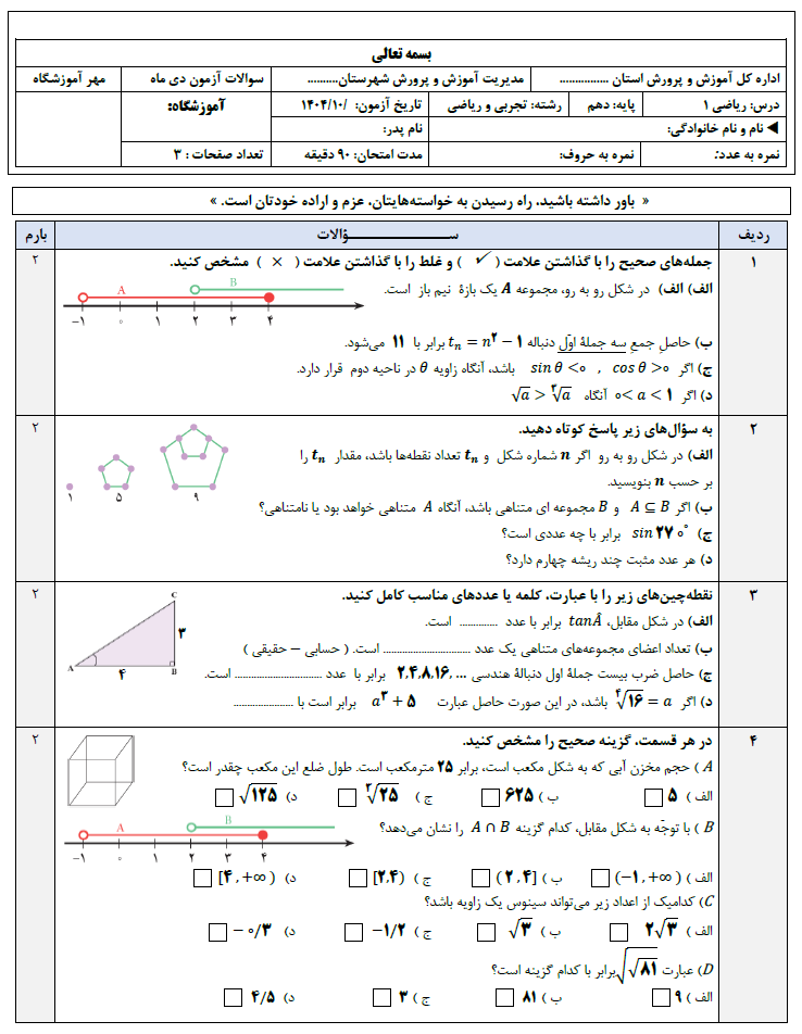 دانلود نمونه سوالات امتحانی ریاضی دهم رشته تجربی و ریاضی نوبت اول ۱۴۰۴ به صورت word؛