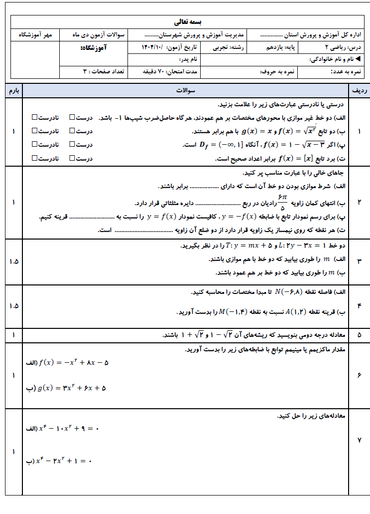دانلود نمونه سوالات امتحانی ریاضی یازدهم رشته تجربی نوبت اول ۱۴۰۴ به صورت word؛