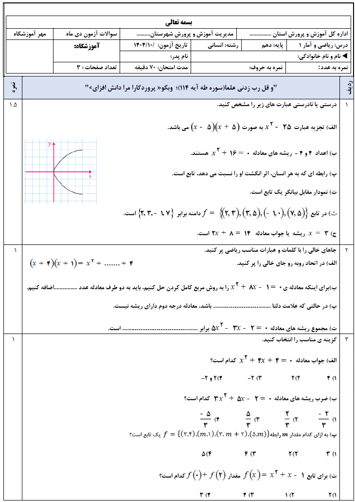 دانلود نمونه سوالات امتحانی ریاضی و آمار دهم انسانی نوبت اول ۱۴۰۴ به صورت word؛