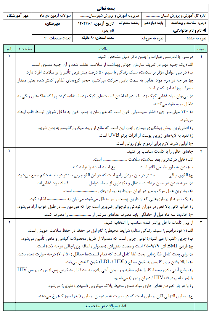 محتویات فایل: نمونه سوال امتحانی سلامت و بهداشت دوازدهم + پاسخنامه در پایان سوالات + بارم بندی جدید