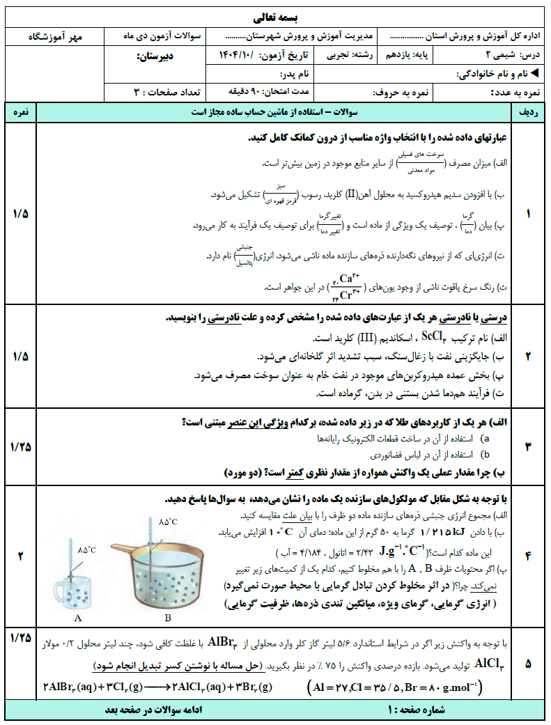 دانلود نمونه سوالات امتحانی شیمی یازدهم نوبت اول ۱۴۰۴ به صورت word؛