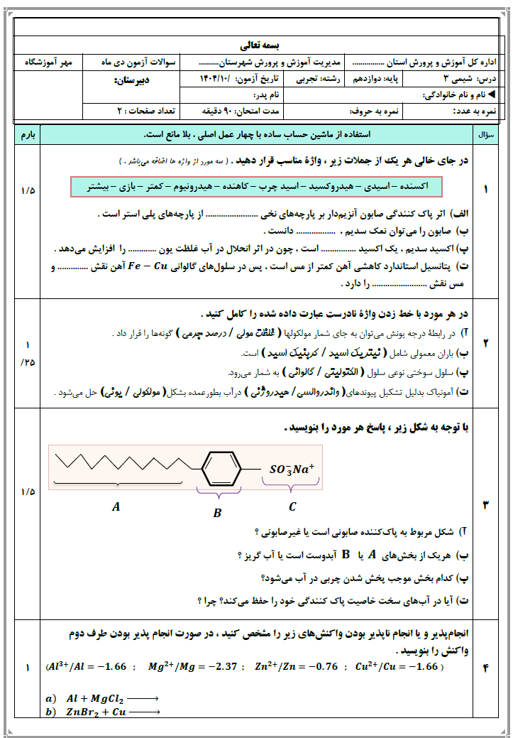 محتویات فایل: نمونه سوال امتحانی شیمی دوازدهم + پاسخنامه در پایان سوالات + بارم بندی جدید