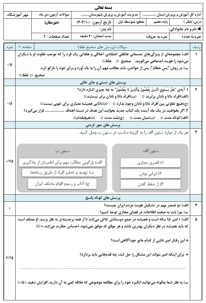 محتویات فایل: نمونه سوال امتحانی تفکر هفتم + پاسخنامه در پایان سوالات + بارم بندی جدید