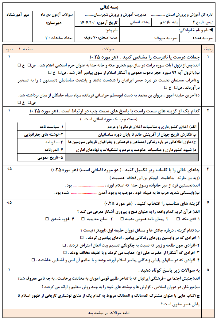دانلود نمونه سوالات امتحانی تاریخ یازدهم نوبت اول ۱۴۰۴ به صورت word؛