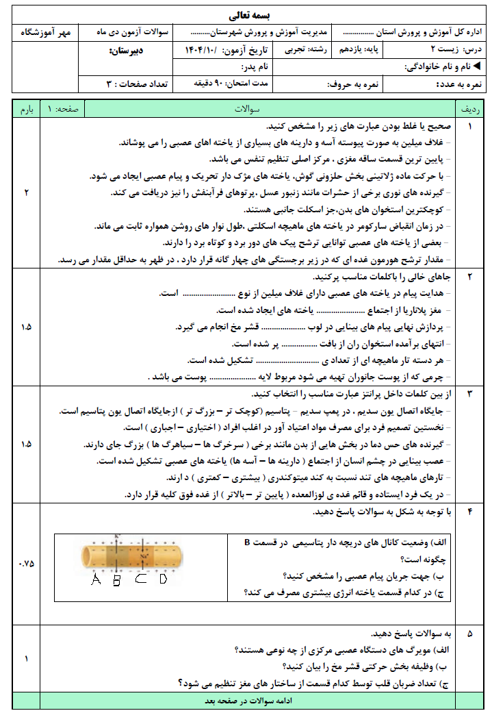 محتویات فایل: نمونه سوال امتحانی زیست شناسی یازدهم + پاسخنامه به صورت فایل جداگانه + بارم بندی جدید