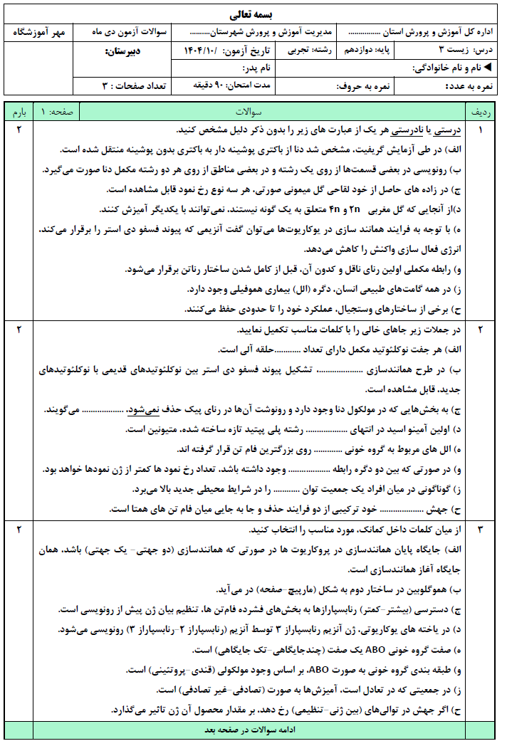 دانلود نمونه سوالات امتحانی زیست شناسی دوازدهم نوبت اول ۱۴۰۴ به صورت word؛
